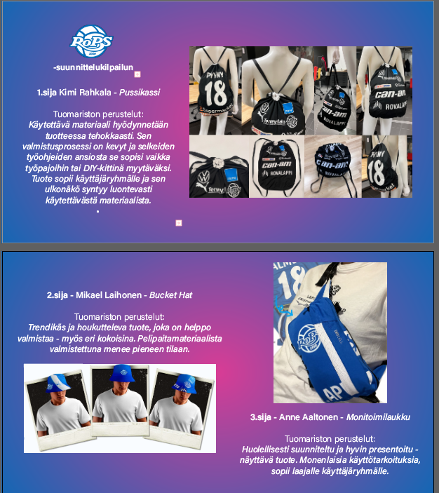 Kilpailun voittajatyöksi valikoitui Kimi Rahkalan suunnittelema RoPS:n vanhasta pelipaidasta valmistettava “pussikassi”, joka kulkee helposti mukana esimerkiksi treeneissä, pelireissuilla tai kaupassa.