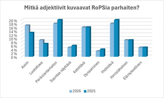 Parhaiten RoPSia kuvaavia adjektiiveja olivat vastaajien mielestä edelleen periksiantamaton, yhdistävä ja kehittävä.